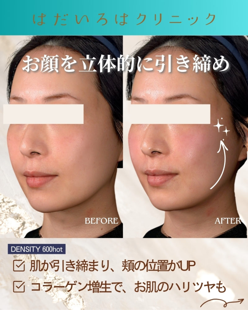 はだいろはクリニックでは特に、しわ・たるみの改善に力を入れています。【ヒアルロン酸×ボツリヌス製剤×HIFU×RF】の全層コンビネーション施術で、患者さまの心がくつろぎ、思わず笑顔になる変化を目指しています。