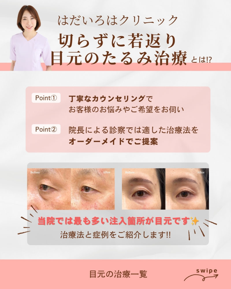 はだいろはクリニックでは特に、しわ・たるみの改善に力を入れています。【ヒアルロン酸×ボツリヌス製剤×HIFU×RF】の全層コンビネーション施術で、背伸びしない美しさを目指しています。